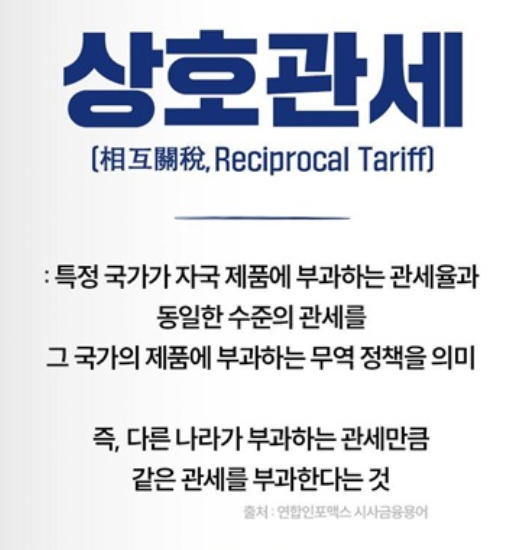 이번 미국에서 부과하는 상호관세란 다른 나라가 자국 상품에 부과한 관세율만큼 똑같이 상대국 제품에 부과하는 방식입니다. ‘눈에는 눈, 이에는 이’라고 이야기 할 수 있는데요.