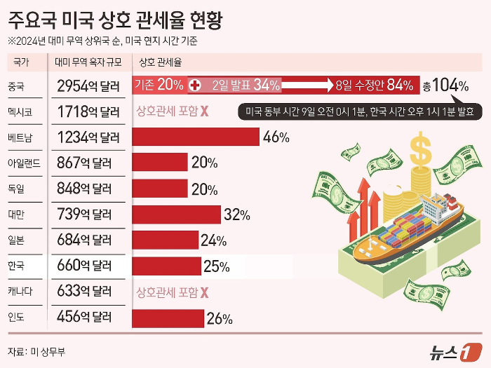각 나라마다 상호관세율이 다르며, 현재는 90일간 유예된 상태입니다.(4/14기준)