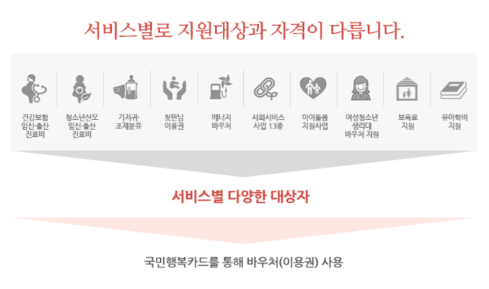 국민행복카드 발급 후 자격 요건에 따라 임산부, 저소득층, 장애인 등 본인에게 맞는 바우처 서비스를 신청하면, 편하게 사용할 수 있습니다.