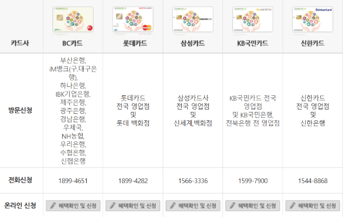 국민행복카드는 국민카드, 신한카드, 롯데카드 등 주요 카드사 홈페이지에서 신청 가능합니다.