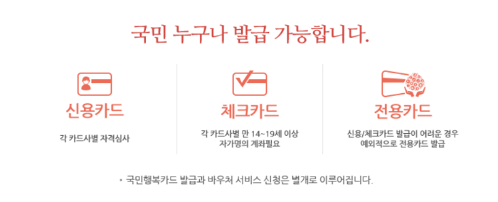 국민행복카드는 국민 누구나 발급이 가능한데요. 국민행복카드 발급과 바우처 신청은 별개로 이루어진다는 점 참고해주세요.