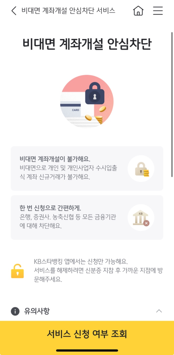 즉, 내가 이 서비스를 신청해두면 인터넷이나 모바일 앱을 통한 신규 계좌 개설이 원천적으로 불가능해집니다.