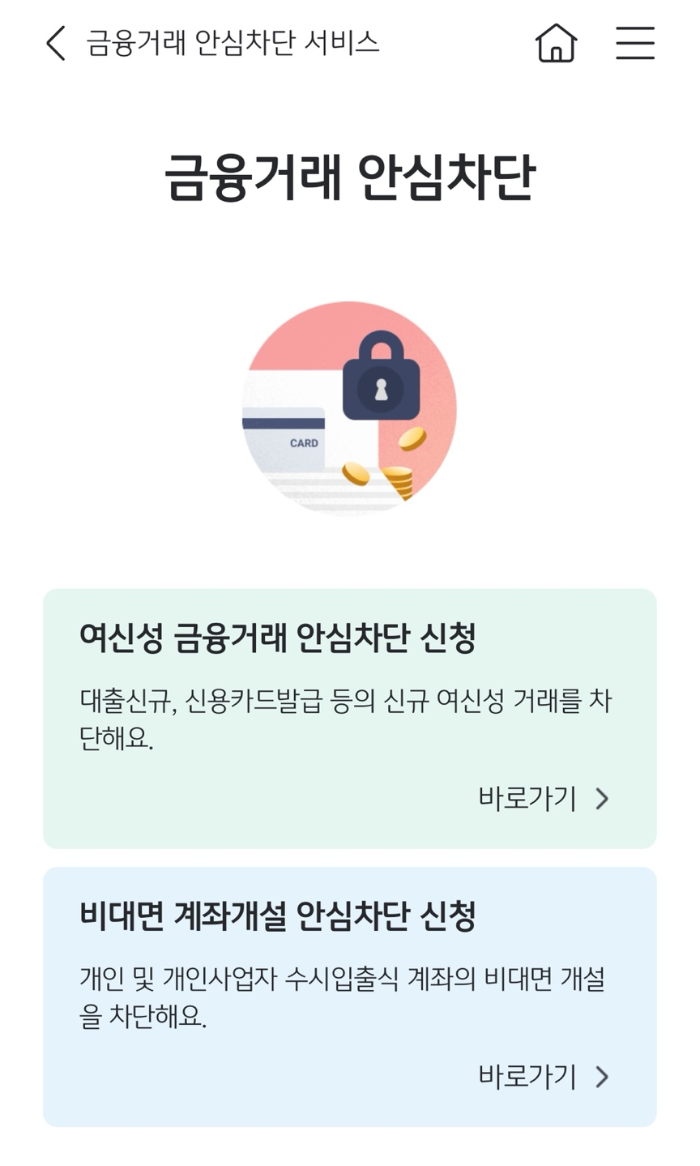 요즘은 대부분의 시중은행 앱에서도 비대면 계좌개설 안심차단 신청이 가능합니다.