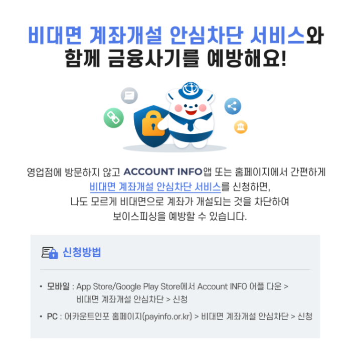 현재는 비대면 계좌개설 차단 신청이 제한적이므로 어카운트 인포를 통한 신청을 권장