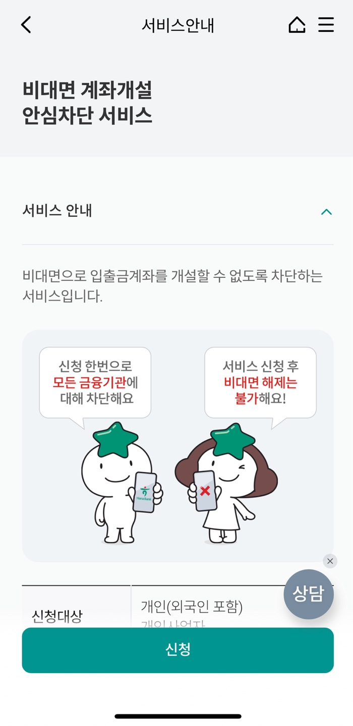 비대면 계좌개설 안심차단 서비스는 한 곳에서만 신청해도 모든 금융기관에 적용되니 주거래 은행 어플 하나를 이용해서 신청해주시면 됩니다.