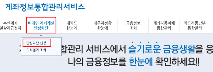 그중 ‘비대면 계좌개설 안심차단 서비스’를 쉽게 신청할 수 있습니다.