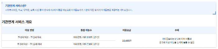 | 기관연계 돌봄 | 어린이집, 유치원 등과 연계한 돌봄 | 연계기관 이용 아동 |