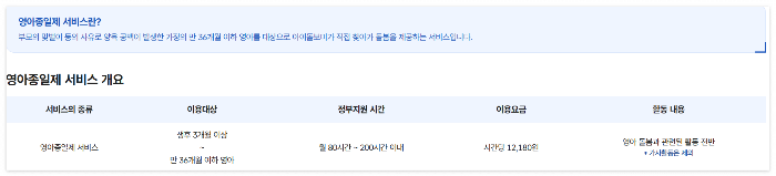 | 종일제 돌봄 | 장시간 돌봄 필요 시(출산, 병원 입원 등) | 만 3개월~36개월 |