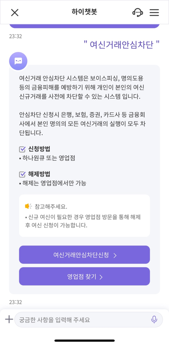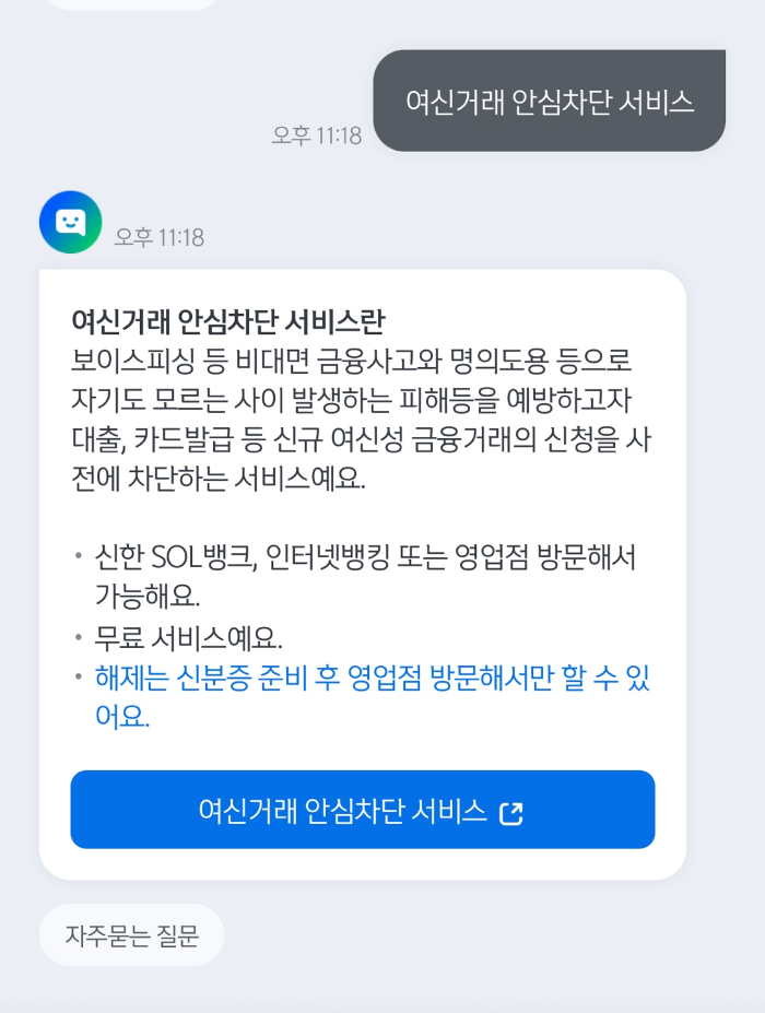 앱 실행 후 챗봇에 여신거래안심차단서비스를 검색 후 신청