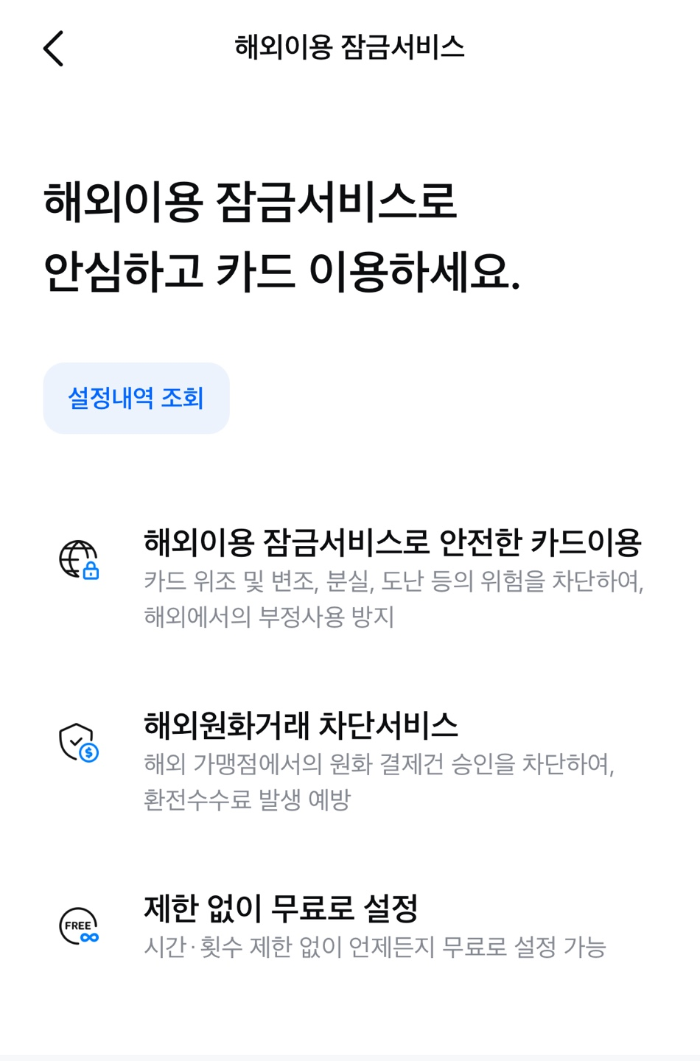 본인이 직접 설정하지 않으면 해외에서 카드 사용 자체가 불가능하도록 막는 기능입니다.
