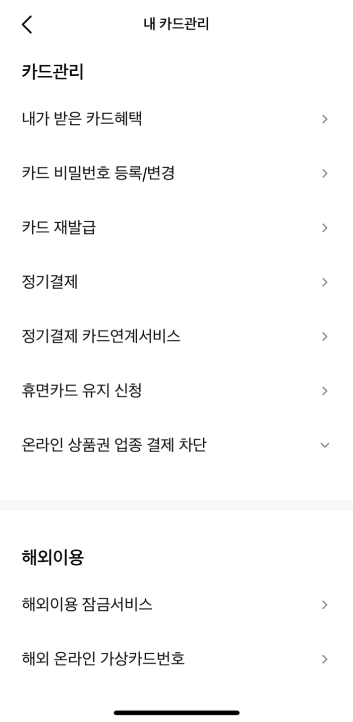 ✅ 카드별 개별 설정 가능 (예: 체크카드는 해외 차단만, 신용카드는 전체 차단 등)