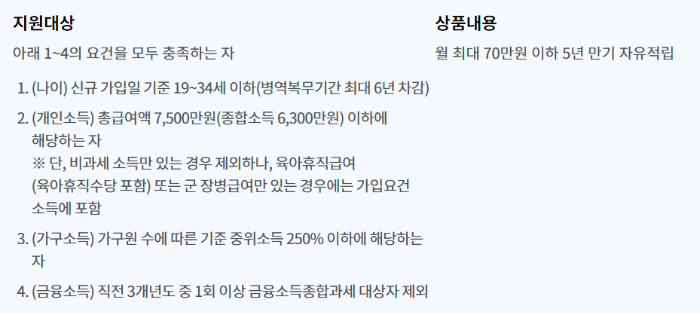 💡 핵심 포인트: 개인 소득 7,500만 원 이하, 가구 소득 180% 이하인 만 19~34세 청년이라면 가입 가능!