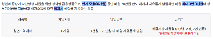 정부가 일정 금액을 매칭 지원하기 때문에 일반적인 적금보다 높은 수익을 기대할 수 있다는 장점이 있습니다.