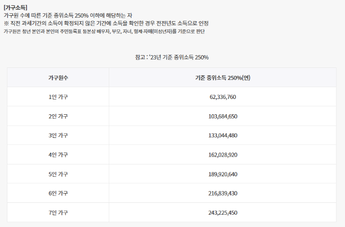 ✅ 가구 소득: 기준 중위소득 250% 이하