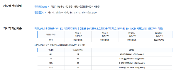 캐시백은 직전 2개년 동월 평균 사용량 대비 올해 절감한 사용량(kWh)에 비례하여 지급됩니다. 절감률이 높을수록 1kWh당 돌려받는 금액이 커지는 누진적인 보상 구조입니다.