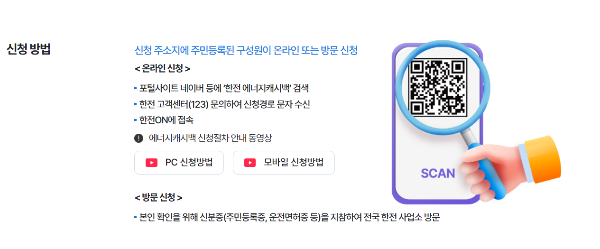 온라인: 한국전력공사 한전ON 모바일 앱 또는 에너지캐시백 홈페이지