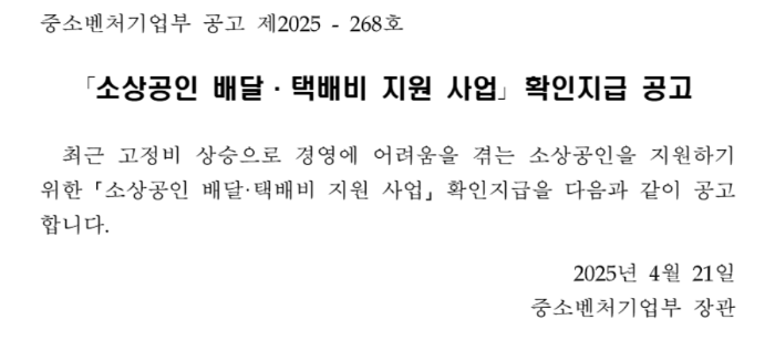 중소벤처기업부에서 시행하는 소상공인 배달·택배비 지원사업이 4월 21일부터 신청 접수를 시작했습니다.