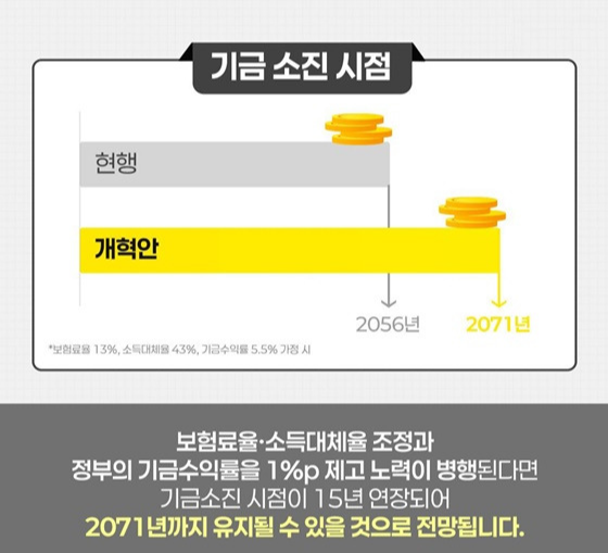 이러한 수익률 제고 노력과 보험료율 인상 및 소득대체율 조정이 함께 이루어지면 국민연금 기금의 소진 시점이 기존 예상보다 15년 더 연장되어 2071년까지 유지될 것으로 전망된다고합니다.