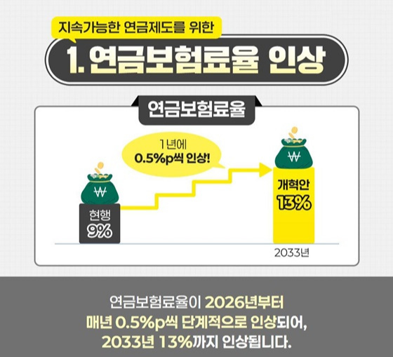 연금보험료율이 2026년부터 매년 0.5%p씩 단계적으로 인상되어, 2033년 13%까지 인상됩니다.