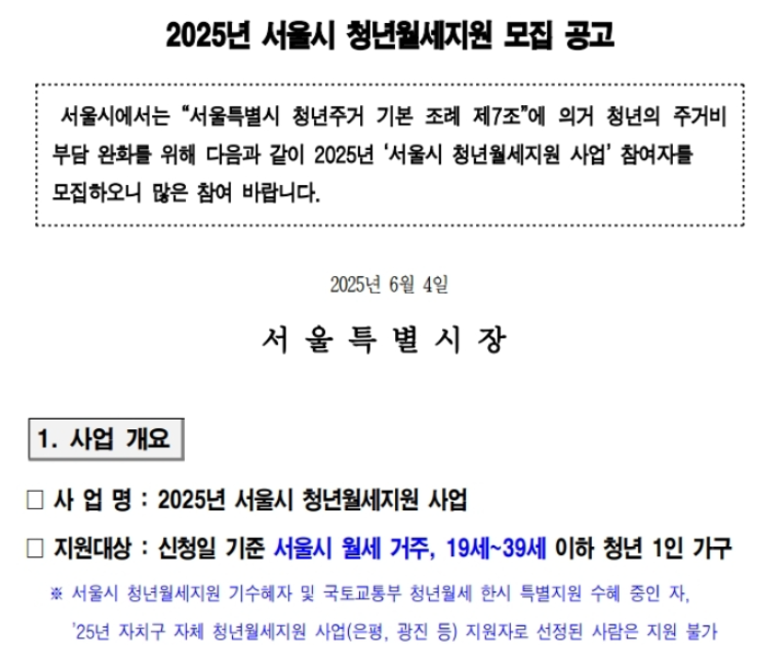 이번 2025 서울시 청년월세지원 사업은 다음 요건을 모두 충족하는 청년 1인 가구를 대상으로 합니다.
