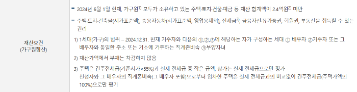 신청 가구가 보유한 총 재산 합계가 2억 4천만 원 미만이어야 합니다.